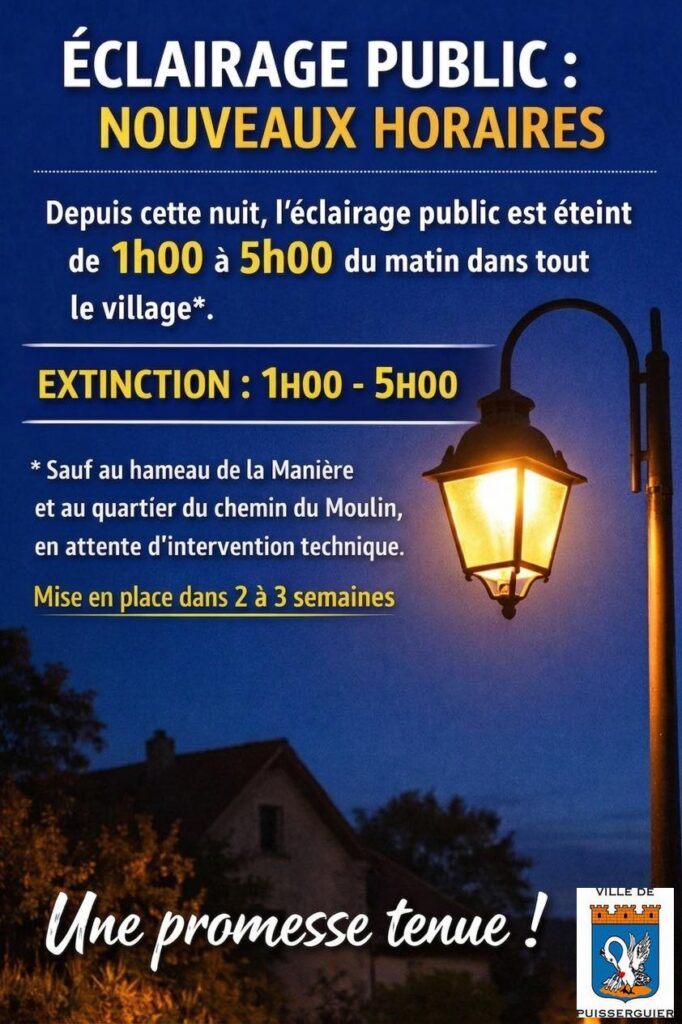 La municipalité informe les habitants d’une modification des horaires de l’éclairage public. Depuis la nuit du 25 au 26 mars 2026, l’éclairage est désormais éteint entre 1h00 et 5h00 du matin sur l’ensemble de la commune. Toutefois, cette mesure ne s’applique pas...