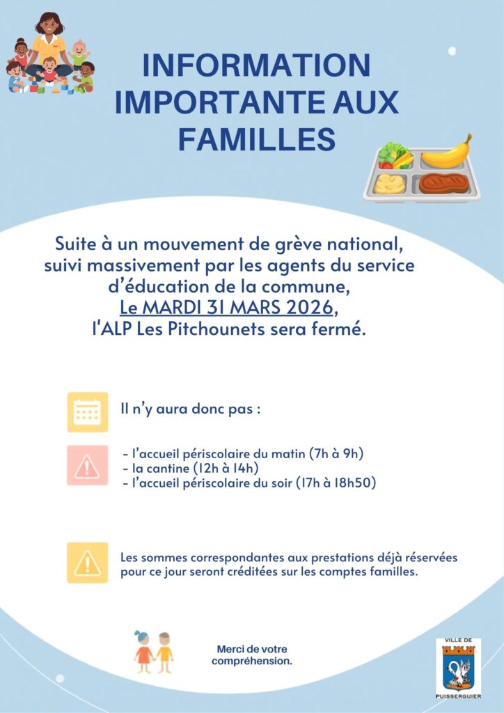 Bonjour , En raison d’un mouvement de grève national, suivi massivement par les agents du service éducation de la commune, nous vous informons que: le MARDI 31 MARS 2026, L'ALP les Pitchounets sera fermé. Il n’y aura donc pas : -l’accueil périscolaire du matin de...