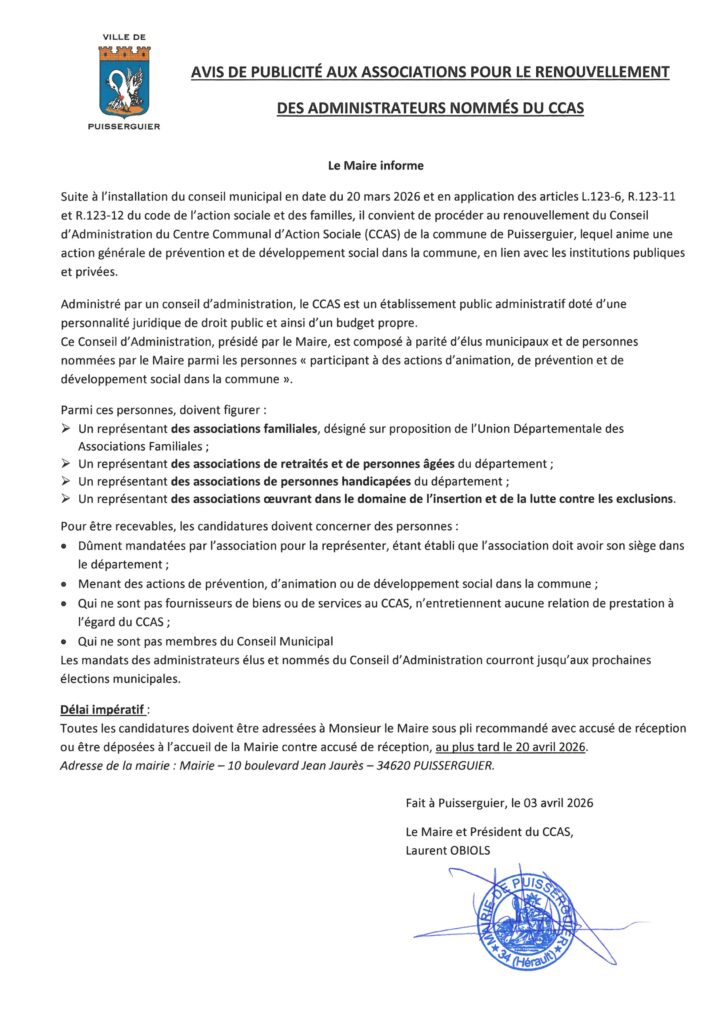 Avis de publicité aux associations pour le renouvellement des administrateurs nommés du CCAS